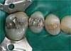Après une isolation soigneuse du champ opératoire, une cavité de gros volume sur une molaire est restaurée par une incrustation adhésive de type « inlay/onlay ». Grâce à ce procédé, la dent reste vivante et la gencive n’est pas agressée. A noter que les inlays/onlays peuvent aussi être réalisés en métaux précieux (or jaune) ; de nos jours cependant, les matériaux « blancs » (composite de laboratoire ou céramique) sont généralement préférés.